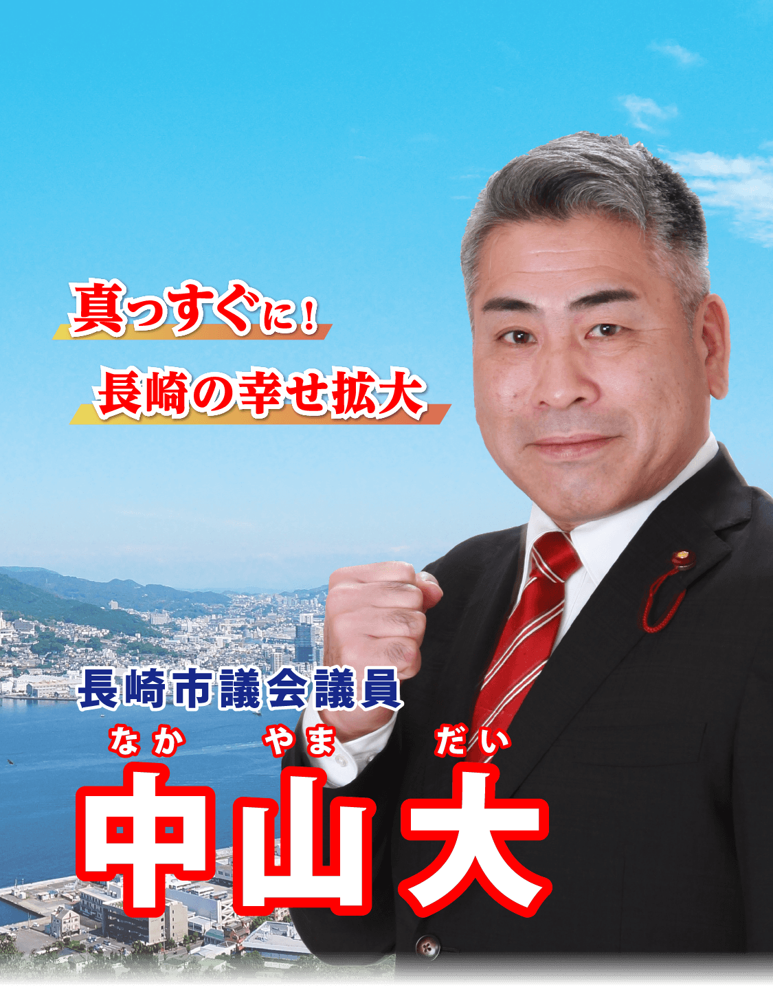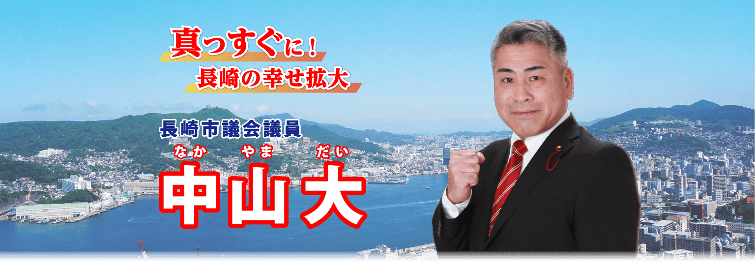 新着情報 2026/01/05 【号外】市政だより(令和8年1月発行)を発行いたしました。 2025/10/08 市政だより第9号(令和7年10月発行)を発行いたしました。 活動情報 日々の活動状況を適宜配信しています。お気軽にご登録下さい。 dn0319 今週は、令和8年度一般会計予算を含めた多くの議案を審議しています。 朝から夕方まで、委員会室にて理 3/1(日)、長崎市中央地区消防合同訓練に参加しました! 天候に恵まれ、中央地区消防団の皆さんが 2/26(木)、市政一般質問の機会を戴きました。 今回は、以下の内容について、本市の考え方を引き出 2/18(水)、令和8年長崎市議会2月定例会が開会しました! 総額2275億6千万円の2026年 2/10(火)、議会運営委員会が開会しました。 これまで疾風の如く過ぎ去った各種選挙への対応でし 長崎は、三つ巴の選挙でしたが、西岡秀子4期目の当選を果たす事ができました🙇♂️ 朝から街頭で、 さらに読み込む Instagramでフォローする LINE facebook Instagram プロフィールを見る プロフィールを見る プロフィールを見る 中山 大が掲げる 4つの政策 未来を担う子供たちのために 人口減少対策のために 経済の活性化のために 安心・安全な街づくりのために 長崎市ホームページ >> 長崎市議会ホームページ >> 【お問い合わせ先】TEL:095-895-5241Mail:d.nakayama0319@outlook.jp